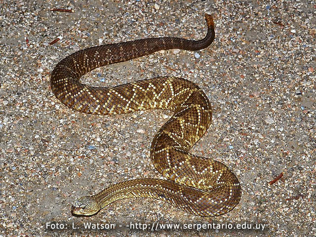 De gran robustez, alcanza entre los 30 y 160 cm de longitud. La caracteriza el apéndice córneo que exhibe en el extremo de la cola, compuesto de hasta 14 segmentos engarzados entre sí y que producen un sonido característico cuando el animal, excitado, los agita. Color de fondo castaño nuez claro, con una serie de 18 ó más rombos, de eje mayor mediodorsal, más oscuros que el fondo y delimitados por escamas blanquecinas. En los flancos presenta triángulos oscuros, bordeados de claro, con un ángulo apuntando hacia dorsal, algunos enfrentándose con los vértices de los rombos dorsales. En la zona del cuello presenta dos líneas laterodorsales longitudinales blanquecinas longitudinales de una escama de ancho y las filas de escamas que quedan así delimitadas, son de coloración más oscura. Dorso de la cabeza con dos franjas longitudinales algo más oscuras que el color de fondo. El vientre es de color crema e inmaculado.