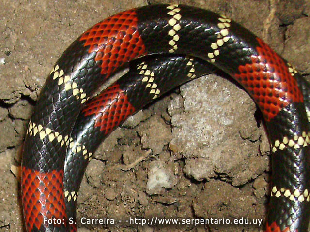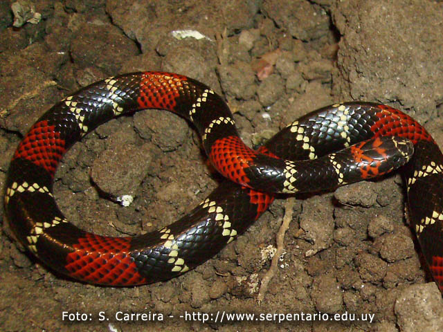 Su dentición es proteroglifa. Presenta aspecto de culebra por sus escamas lisas y brillantes, la falta de distinción entre cabeza y cuello y por su pequeña cabeza cubierta de escamas grandes; mide entre 18 y 80 cm. Se identifica por su diseño consistente en anillos completos alrededor del cuerpo, dispuestos en 11 a 15 tríadas, separadas por anillos anchos rojo coral. Cada tríada se compone de 3 anillos negros, más ancho el central, separados entre sí por otros, finos, amarillos. Las bandas rojas son más angostas que las tríadas. Su cabeza y ojos son pequeños. La cola es muy corta y de punta roma.