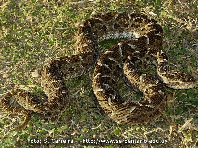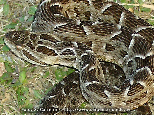 Es una especie cercanamente emparentada con la anterior y fue, por mucho tiempo, confundida con ella. Es poco robusta, de entre 22 y 92 cm de longitud, de aspecto general agrisado. Color de fondo castaño grisáceo, más o menos oscuro, según el ejemplar. Presenta, a cada lado del cuerpo un diseño dorsolateral consistente en manchas castaño oscuras en forma de trapecio, con la base menor hacia el dorso y los bordes oblicuos delineados en un tono blanquecino difuso. Por debajo de la base del polígono, frente a sus ángulos, hay dos manchas secundarias, pardas y ovaladas. Estos dibujos pueden alternarse o enfrentarse con los de la serie del flanco opuesto. En muchos ejemplares se advierte una zona lateroventral de color salmón claro. El diseño cefálico se compone de manchas gruesas, irregulares, castaño oscuras, sobre fondo más claro, rodeadas de un halo blanquecino en algunos ejemplares y dispuestas en forma más o menos simétrica. En el vientre, claro, presenta pequeñas manchas oscuras, difusas, que se agrupan en la base de cada escama. Hasta el año de edad, el extremo de la cola es blanquecino.