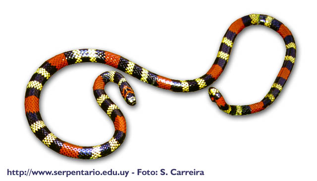 Breve Descripción Su dentición es proteroglifa. Presenta aspecto de culebra por sus escamas lisas y brillantes, la falta de distinción entre cabeza y cuello y por su pequeña cabeza cubierta de escamas grandes; mide entre 18 y 80 cm. Se identifica por su diseño consistente en anillos completos alrededor del cuerpo, dispuestos en 11 a 15 tríadas, separadas por anillos anchos rojo coral. Cada tríada se compone de 3 anillos negros, más ancho el central, separados entre sí por otros, finos, amarillos. Las bandas rojas son más angostas que las tríadas. Su cabeza y ojos son pequeños. La cola es muy corta y de punta roma. |